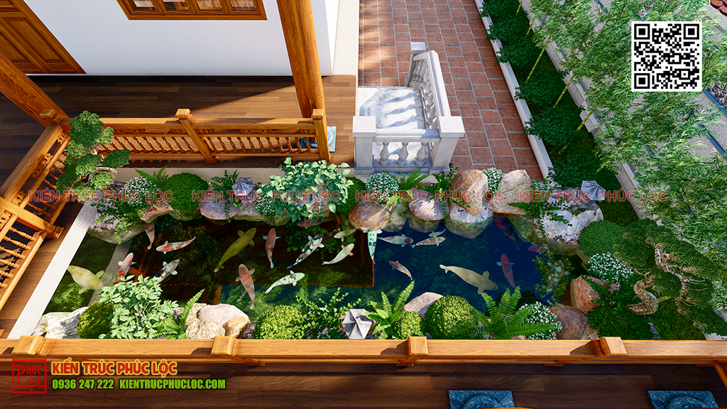 - Thiết kế cảnh quan sân vườn là sắp đặt các tiểu cảnh đúng vị trí và theo phong thủy. Ví dụ cây xanh sẽ được trồng ở 2 bên lối đi từ cổng vào, ao cá nên được đặt ở hướng đông là tốt, bàn ghế nên được đặt dưới bóng cây,….